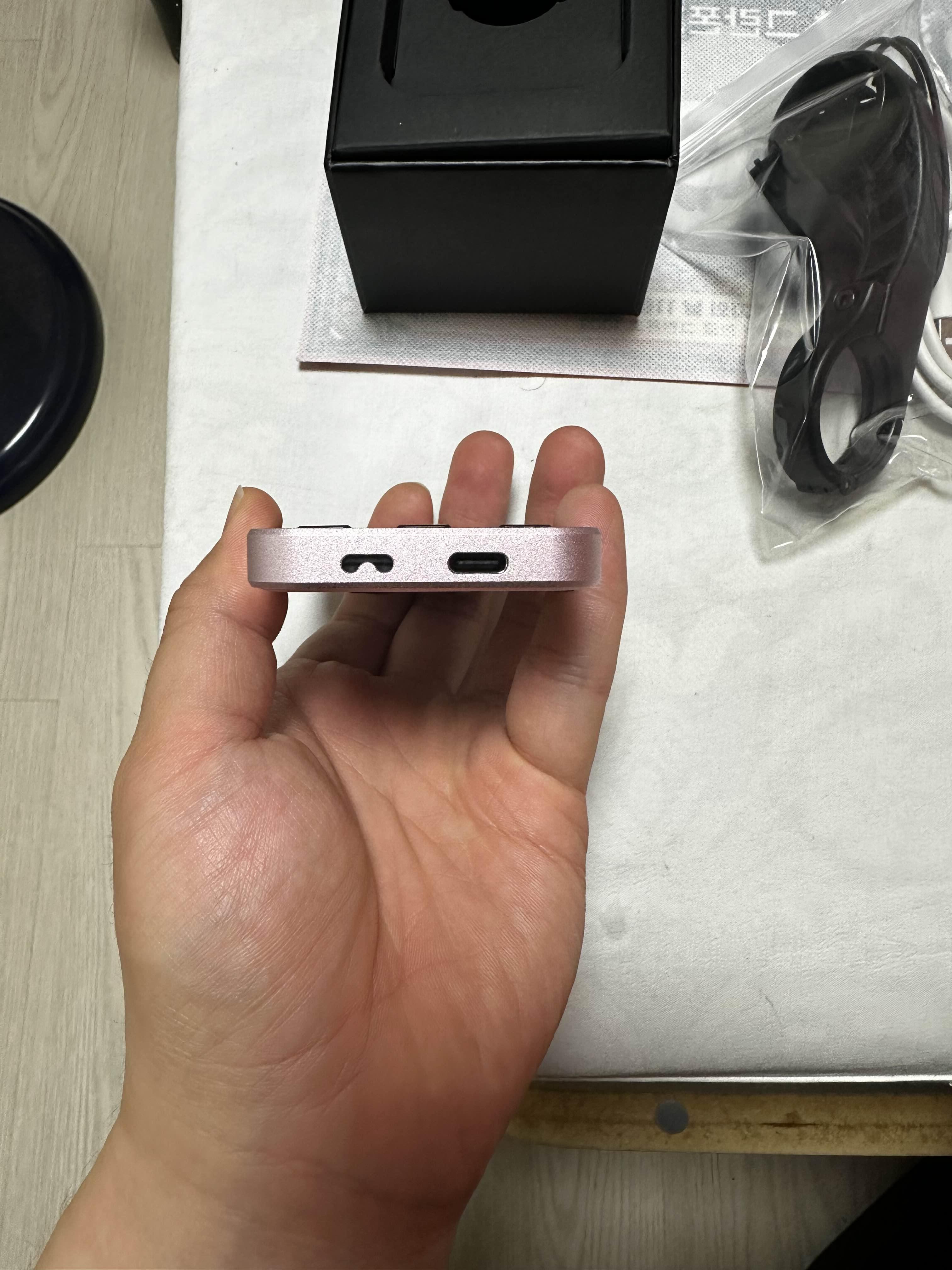 뒷면과 하단입니다. 하단에는 충전을 위한 C타입 충전단자와 이탈방지끈을 장착할 수 있는 홀이 있습니다.