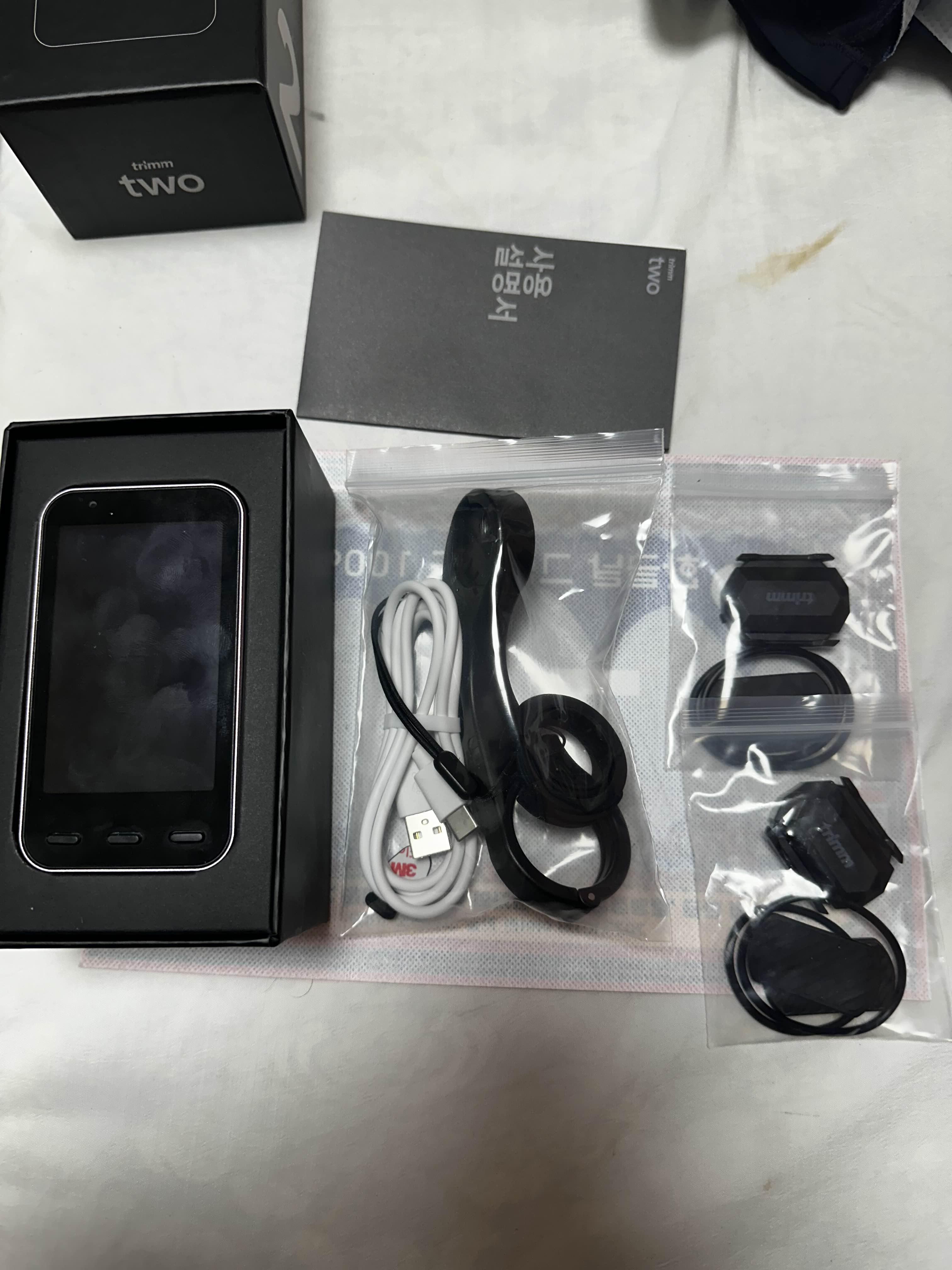 트림투 본체, 순정 속도계마운트, 충전선(USB A TO C), 이탈방지끈, 충전단자 마개, 트림 센서2개